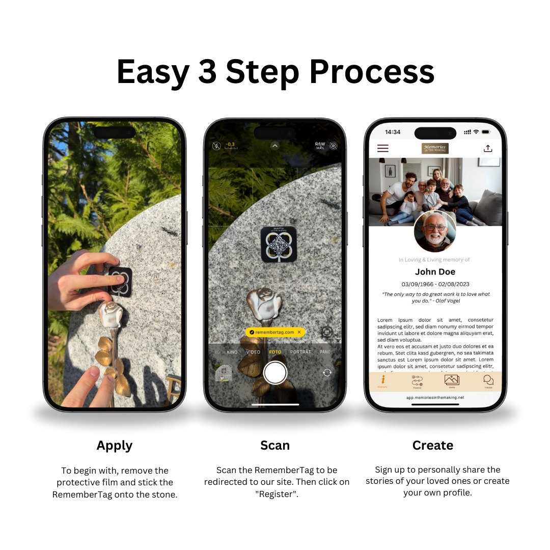 Once you receive your MemorialTag, scan the QR code and follow the instructions to create a digital profile. You can upload text, images, and videos. Anyone who scans the code will be directed to the profile page you created.